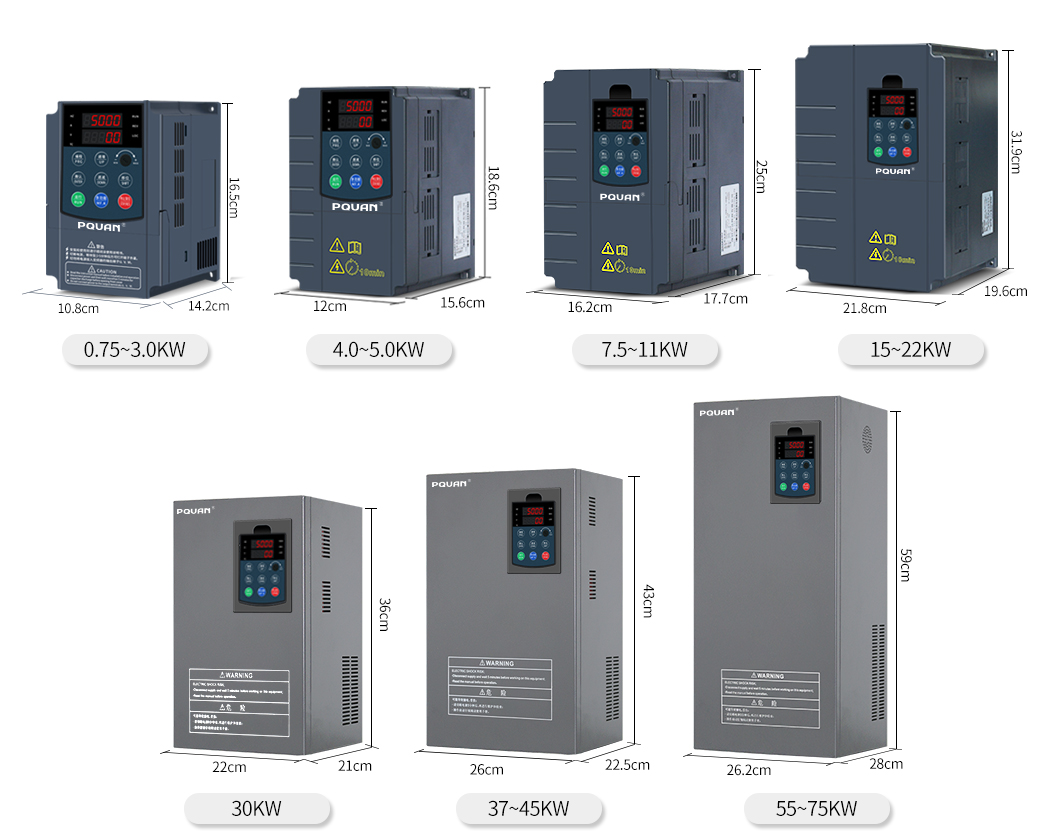 | Modelo de inversor | Capacidad de potencia | Corriente de entrada | Corriente de salida | Motor adaptativo | Dimensión periférica | Abertura de instalación | Fachada | ||||