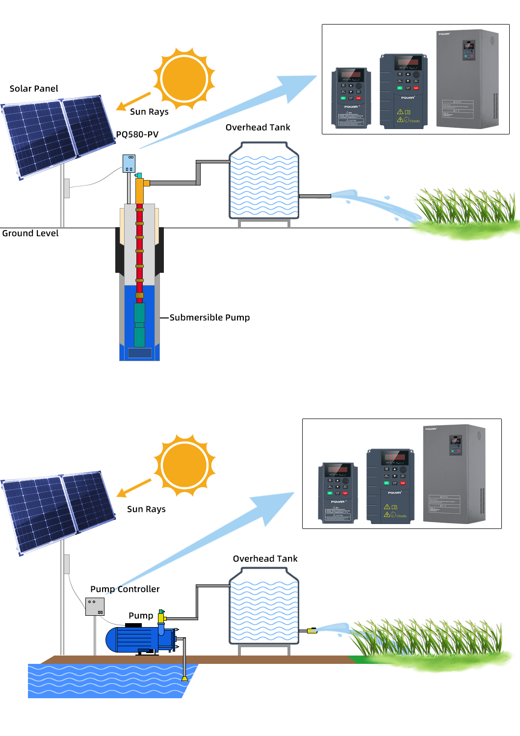 Basta con conectar el panel fotovoltaico al variador de frecuencia, sin necesidad de configurar ningún parámetro, y la bomba fotovoltaica puede ponerse en marcha automáticamente tras el encendido.