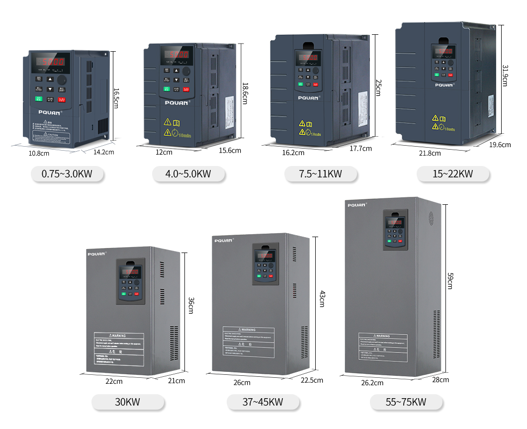 | Modelo de inversor | Capacidad de potencia | Corriente de entrada | Corriente de salida | Motor adaptativo | Dimensión periférica | Abertura de instalación | Fachada | ||||